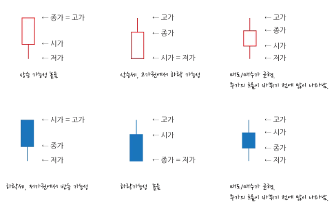 막대기 형태로 주가의 움직임을 표현한 그래프를 말한다. 하루의 주가를 표시한 것을 일봉, 한 주의 주가를 표시한 것을 주봉, 한 달의 주가를 표시한 것을 월봉이라 부르고, 분 단위로 표시한 것을 1분동, 5분봉, 10분봉 등으로 부른다. 아래에서는 일봉이라 가정하고 설명한다. 봉을 크게 두 가지로 분류하면 양봉과 음봉이 있다. 양봉은 그 날의 종가가 시가보다 오른 경우이고, 음봉은 종가가 시가보다 내린 경우이다. 차트가 흑백인 때에 양봉은 흰색, 음봉은 검은색으로 표현하고, 컬러인 때에는 양봉은 속이 빈 붉은색, 음봉은 푸른색으로 표현한다. 시가(Opening Price)란 하루 중 가장 먼저 성립된 가격을 말하며 시초가라고도 한다. 종가(Closing Price)란 하루 중 가장 나중에 성립된 가격을 ..