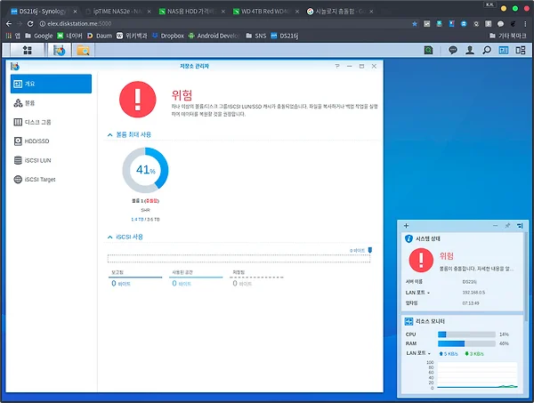 시놀로지 NAS DS216j 웨스턴디지털 WD Red 4TB * 2 갑자기 나스가 삑삑 거린다.충돌함!이게 뭔 소린가 싶다가,하늘이 노래졌다가..데이터 백업할 걱정에...새 디스크 가격 검색도 해 보다가.. 그러던 중 다시 삑삑...나머지 하드디스크도 사망했다는 신호. 하드 2개가 동시에 나가버리니 그 동안 레이드로 묶어 놓은 보람도 없고.. 혹시나 싶어 분해 후 먼지 제거. 그러나 소생 불가. 빨간 딱지 붙은거 NAS 전용이라고 비싸게 주고 산건데 이딴식으로 사망해 버리면... 다시는 WD 하드는 사지 않을 것 같다.